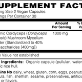 Ingredients: Organic Cordyceps (Cordyceps Sinensis), Mushroom Mycelium Powder (Standardized to 40% polysaccharides [400mg]), Organic capsule (pullulan, water), organic rice hull.